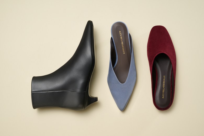 In step with its 10th anniversary, the NYC-based footwear brand Margaux has introduced a capsule collection with clothing brand Alex Mill comprised of a slip-on backless flat, a kitten-heeled boot and a kitten-heeled mule, rendered in chocolate suede, black velvet and blue satin.